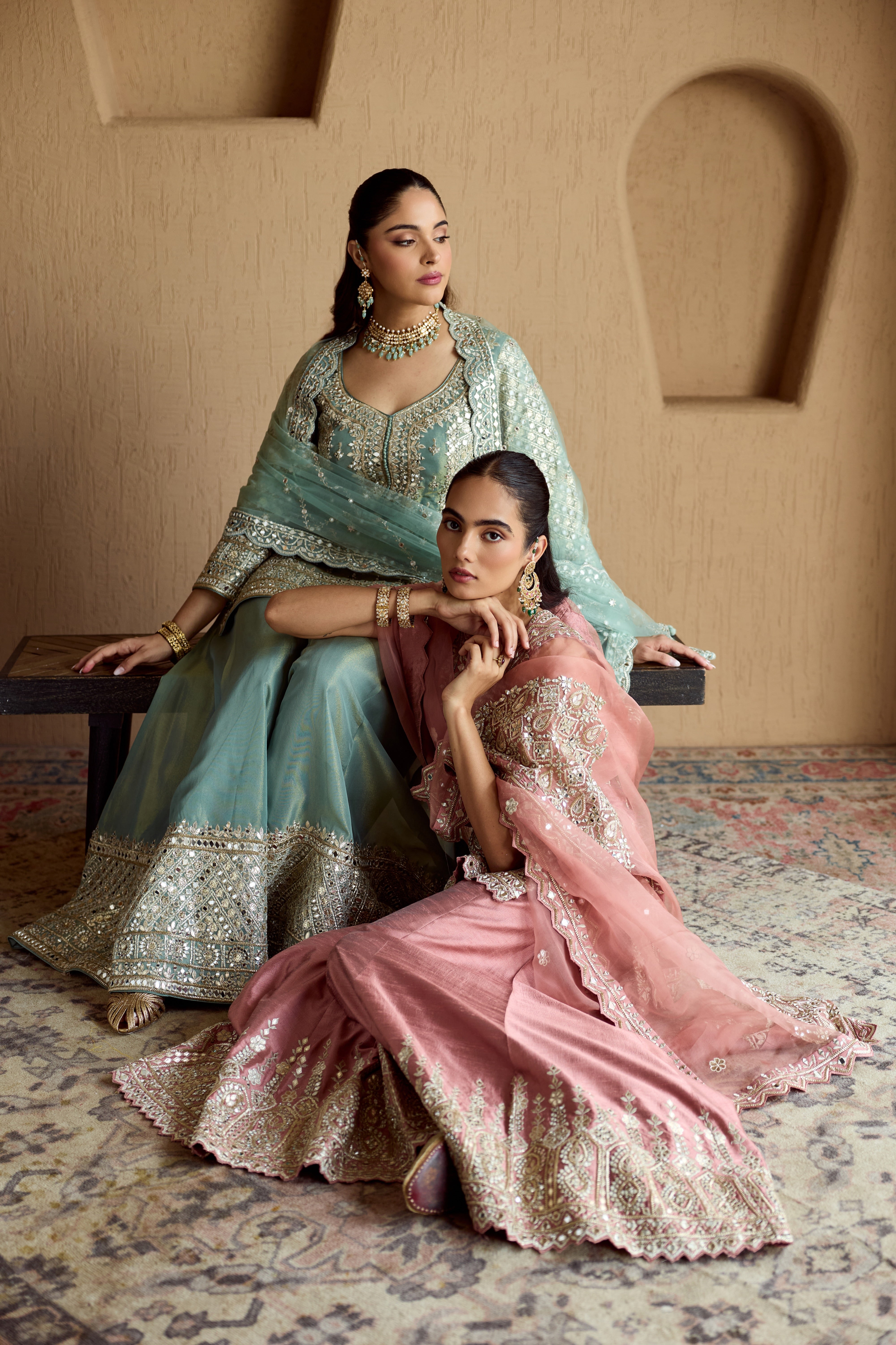 The Chakor, a four-sided form, shapes motifs and patchwork across this collection, echoing legacy through intricate embroideries and, glimmering gota work.