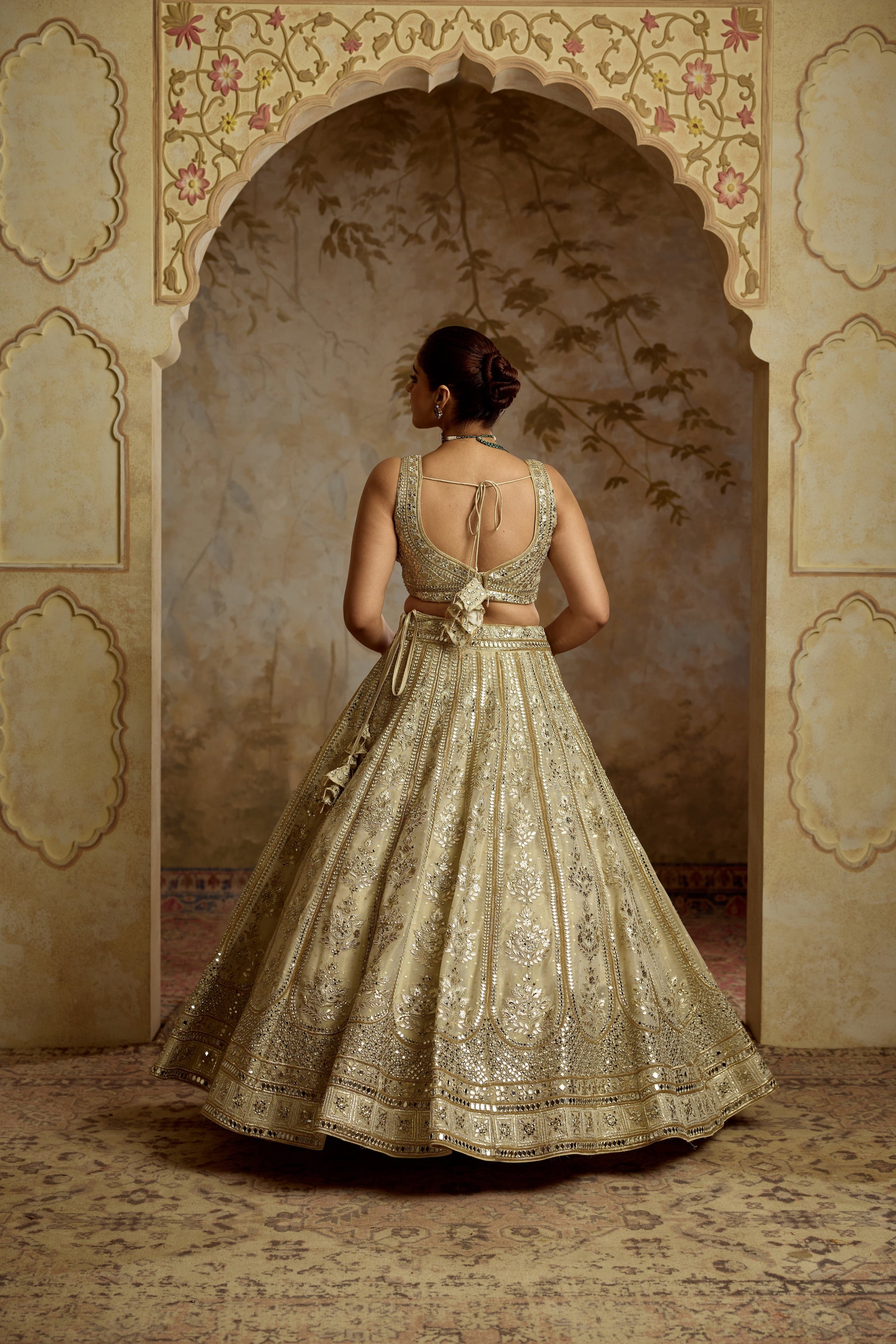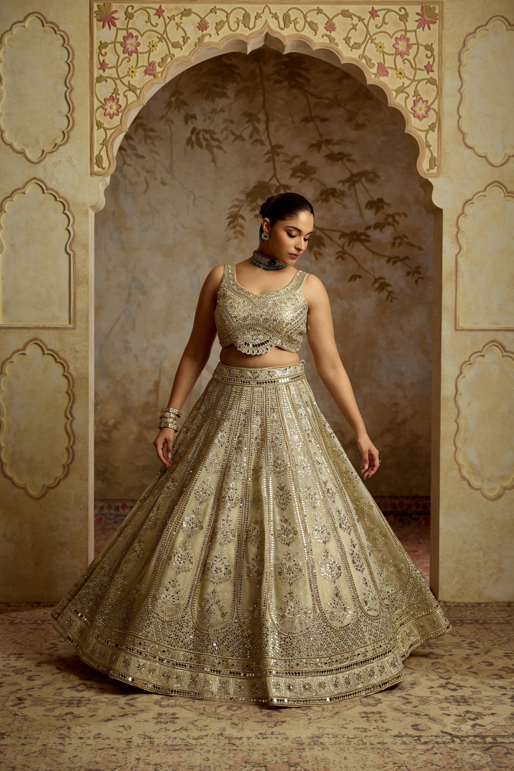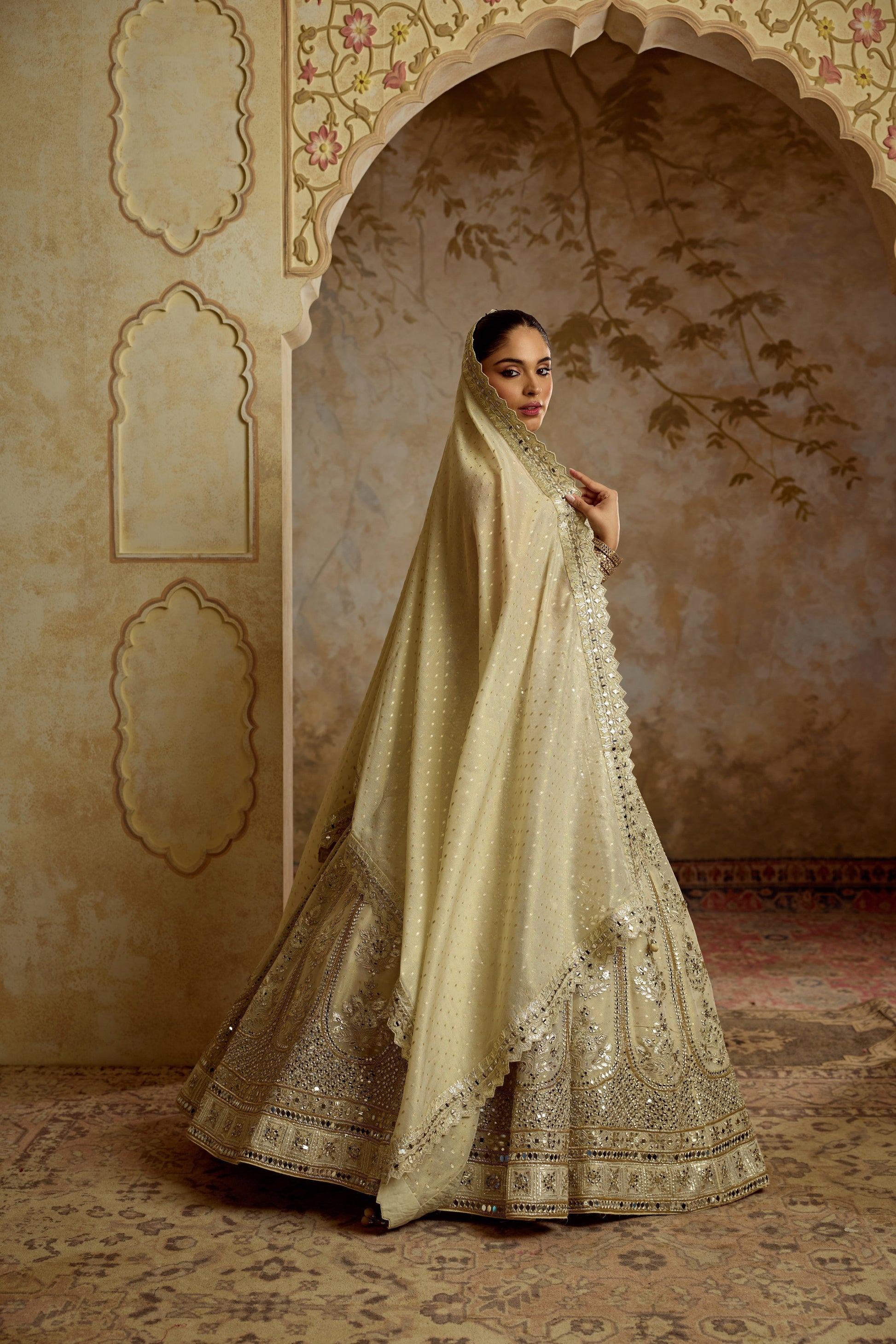 IVORY TISSUE LEHENGA SET EMBROIDERED WITH ZARI MIRRORWORK.