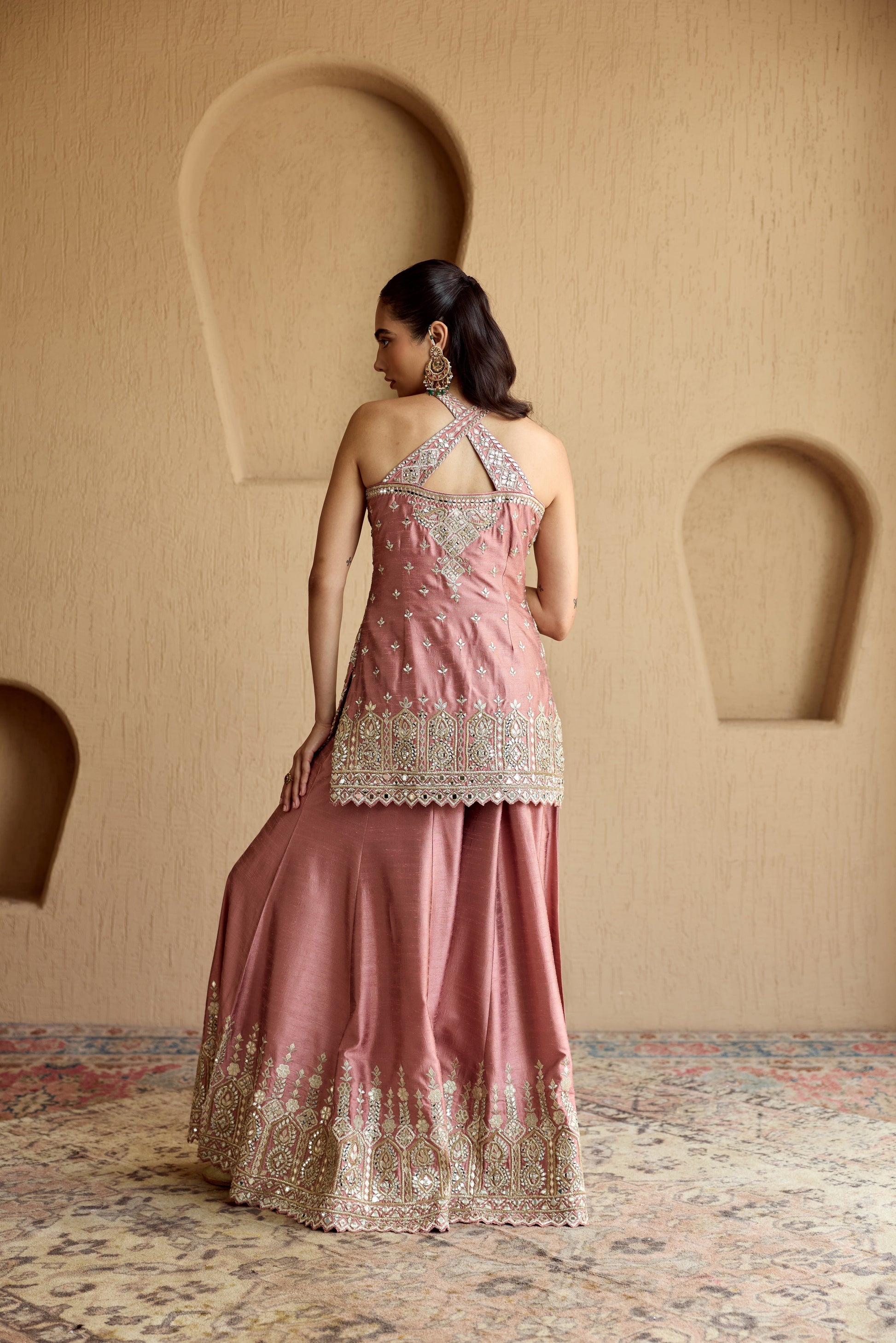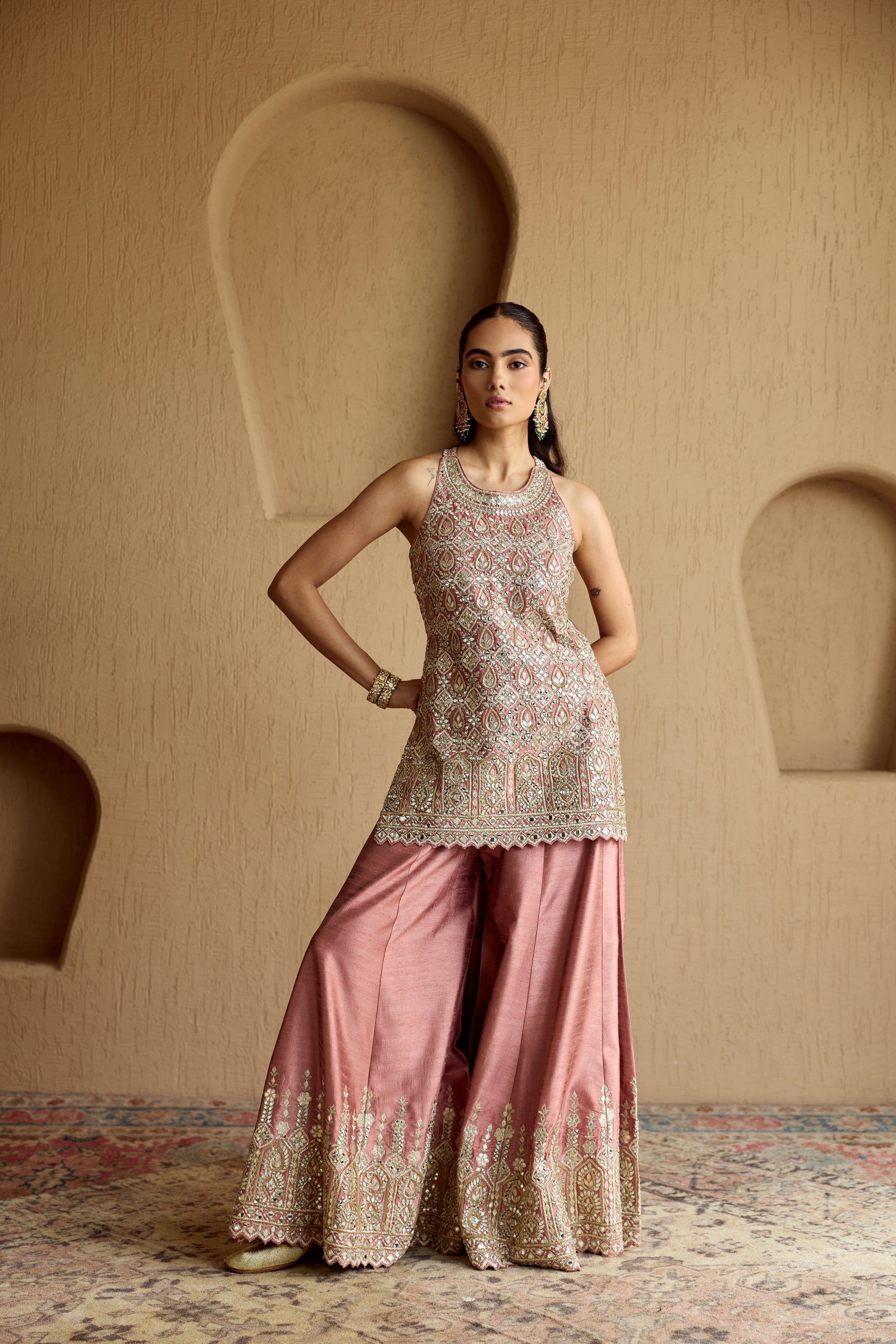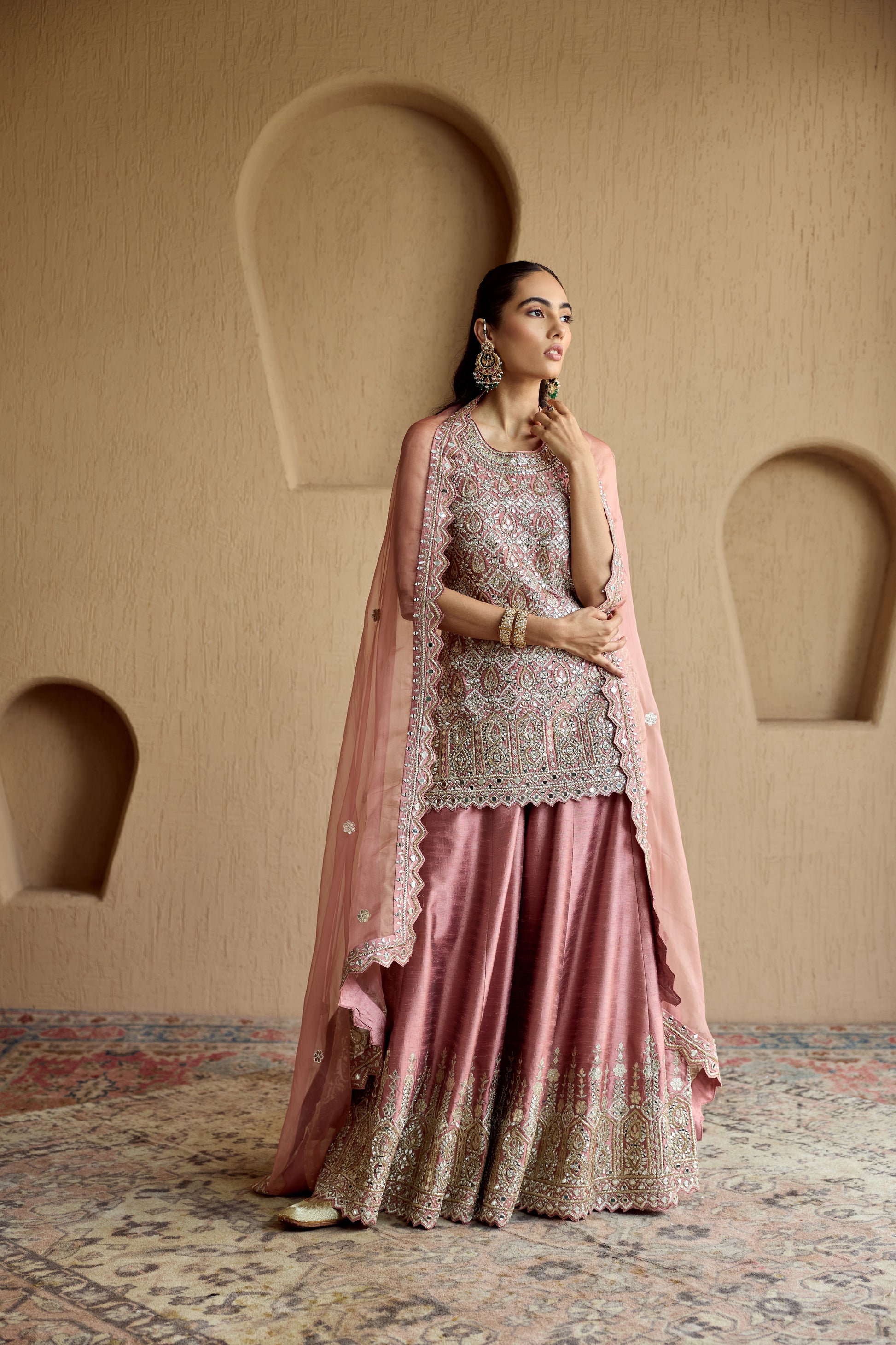 PINK SILK KURTA SHARARA SET EMBROIDERED WITH MIRRORWORK.