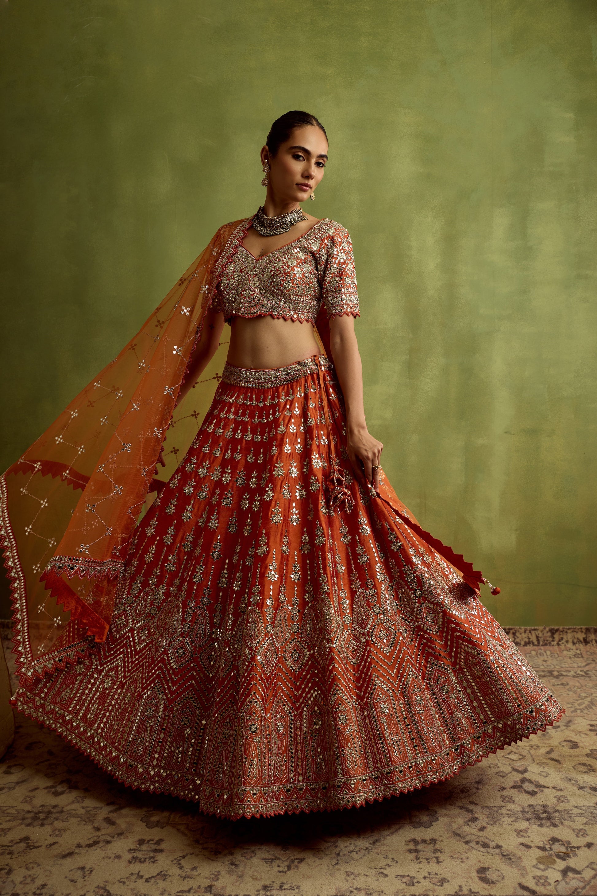 RUST SLUB SILK LEHENGA SET EMBROIDERED WITH ZARI MIRRORWORK.