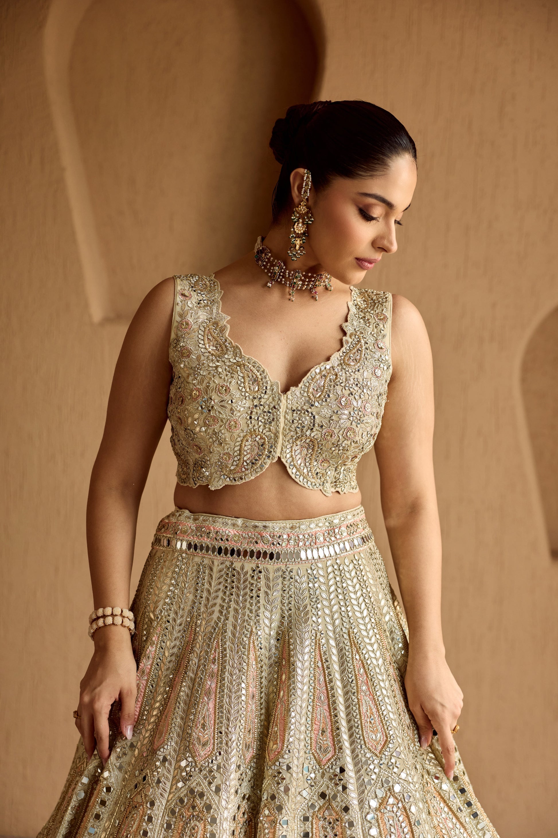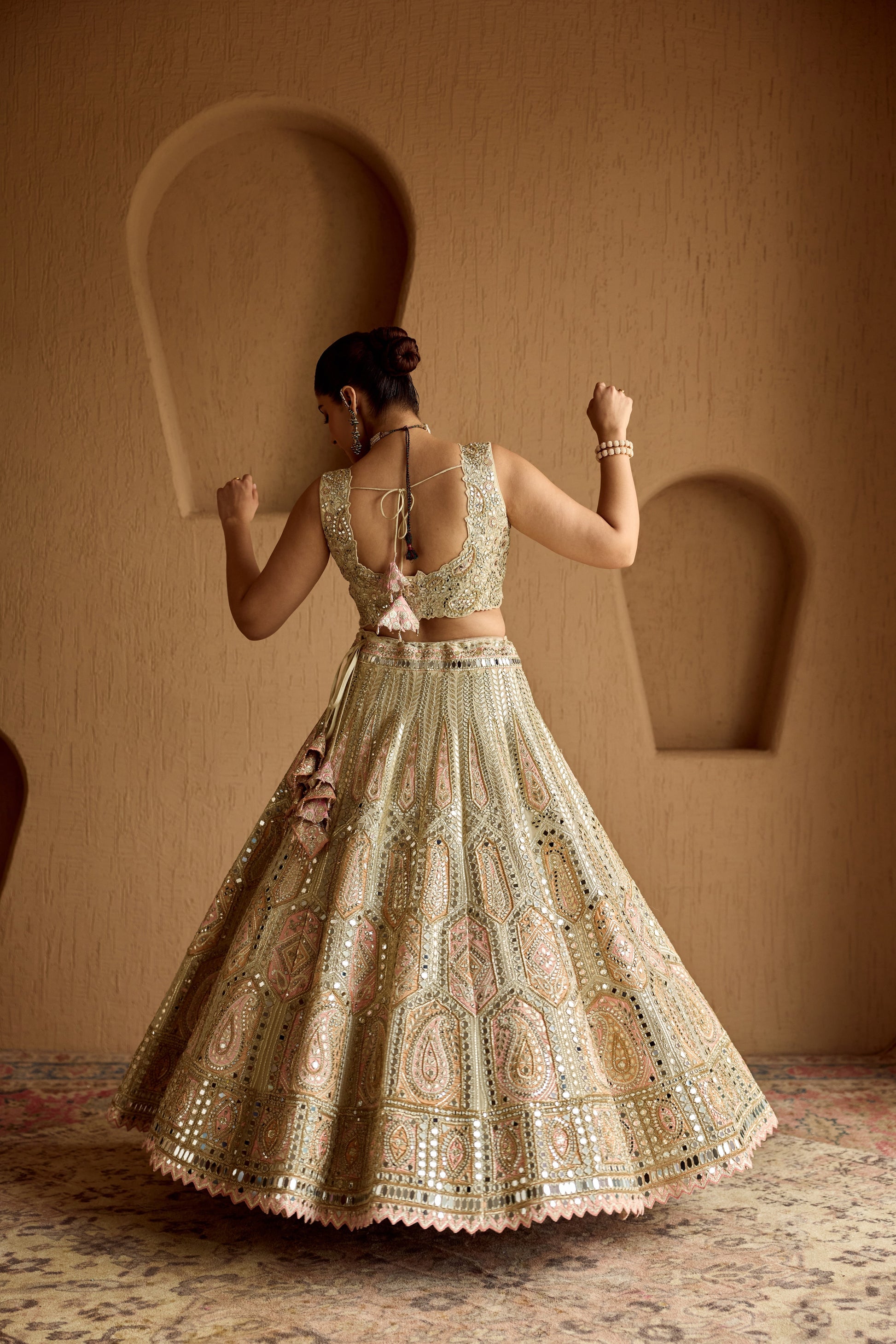 IVORY TISSUE WITH PEACH AND PINK PATCH LEHENGA SET EMBROIDERED WITH MIRRORWORK.