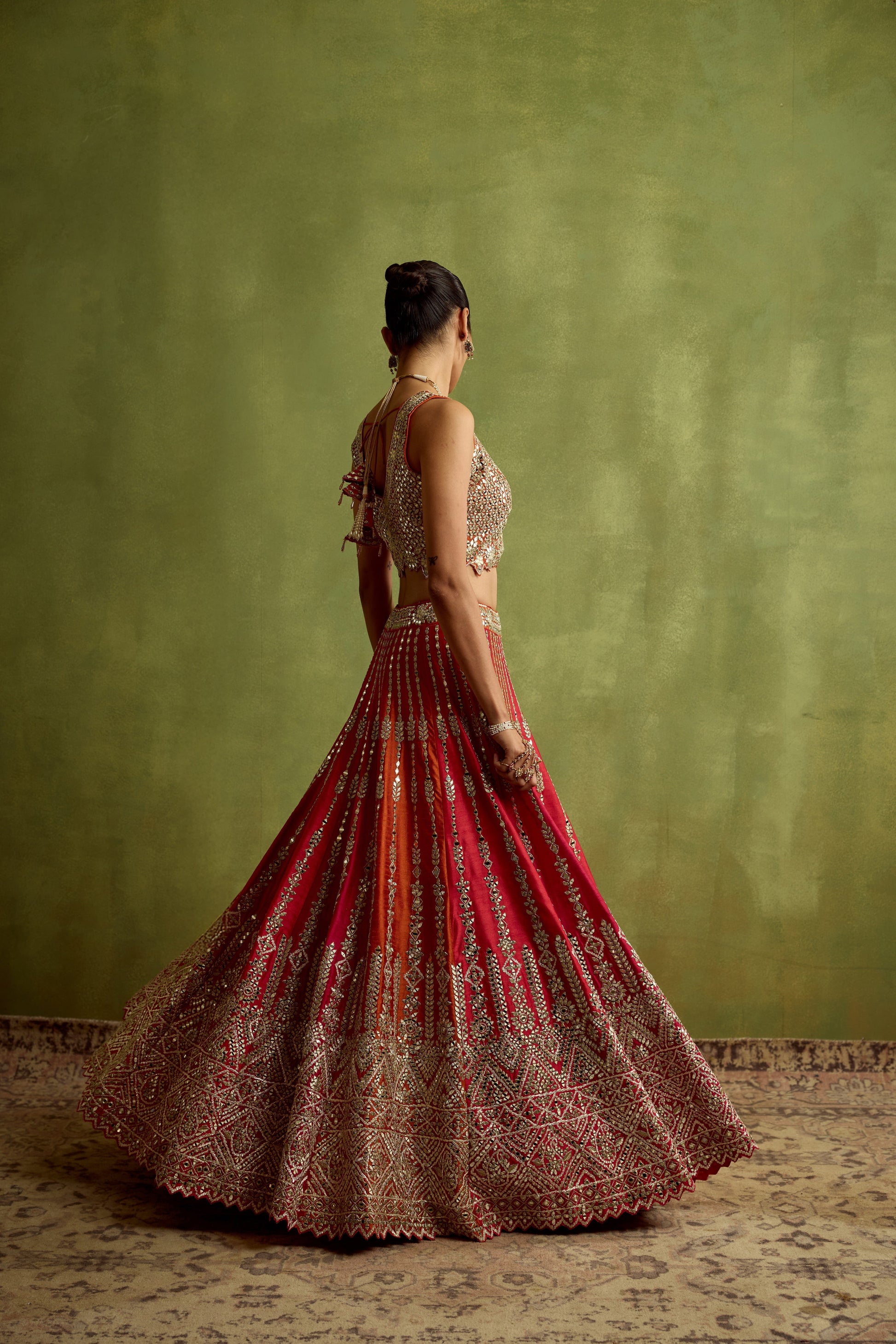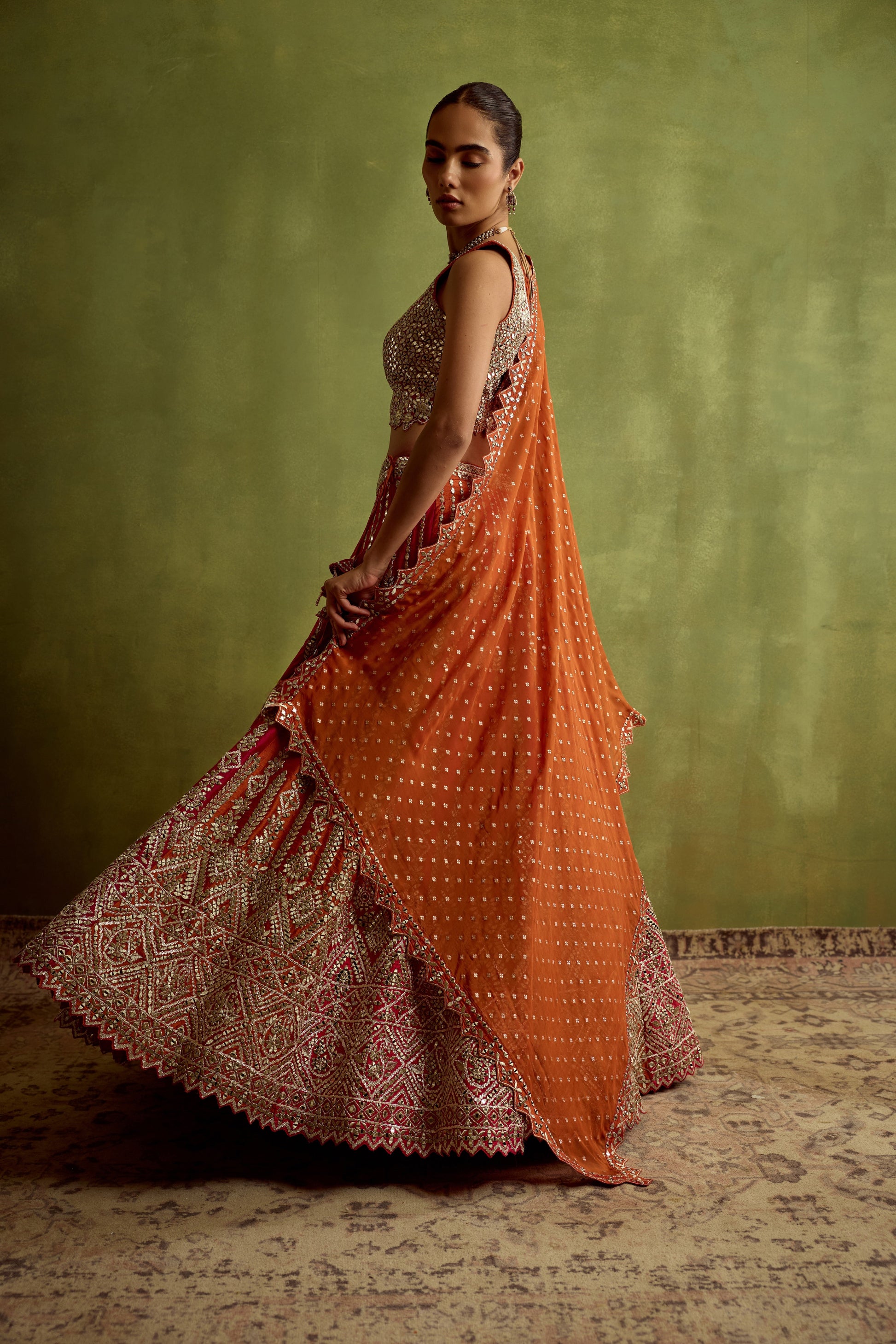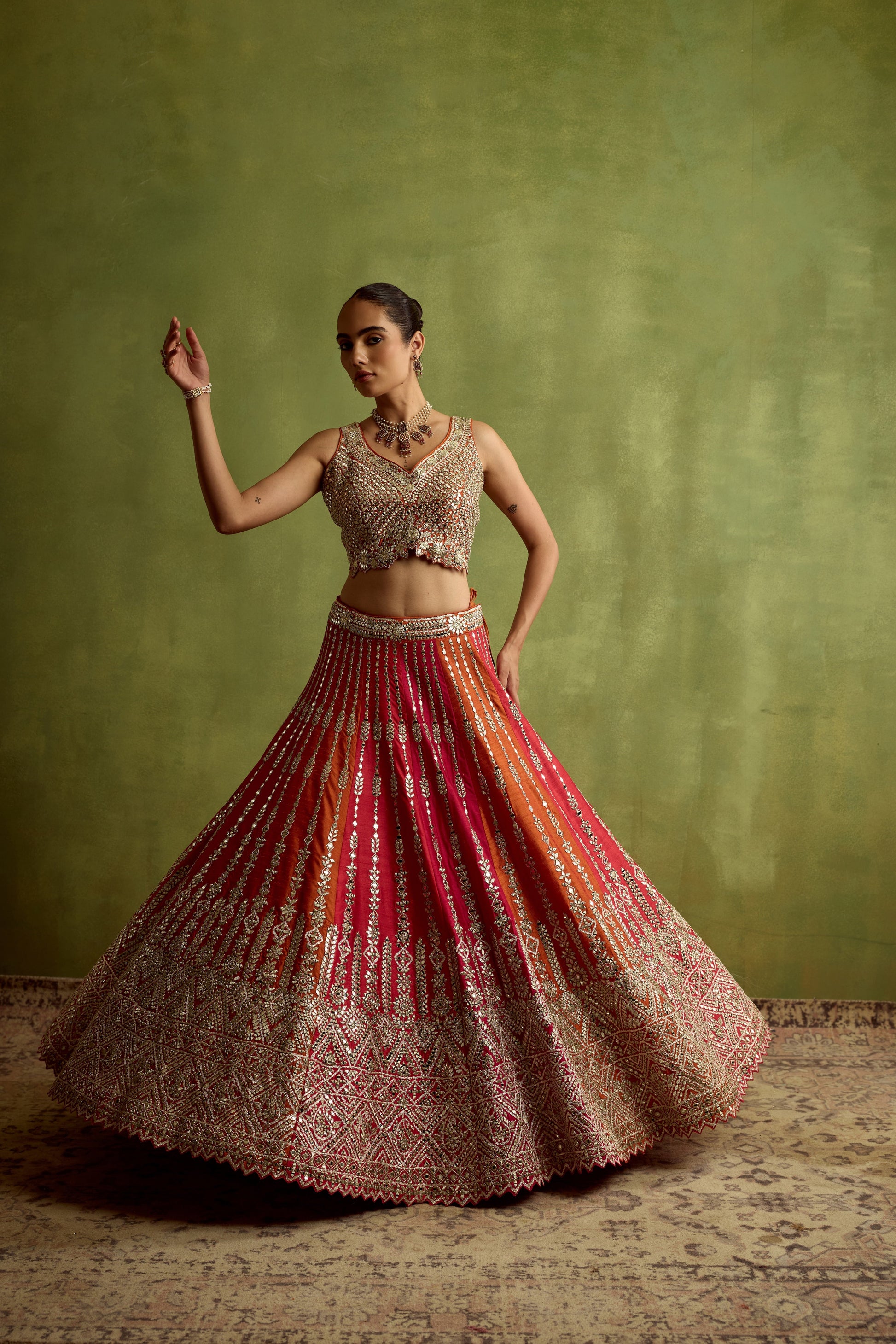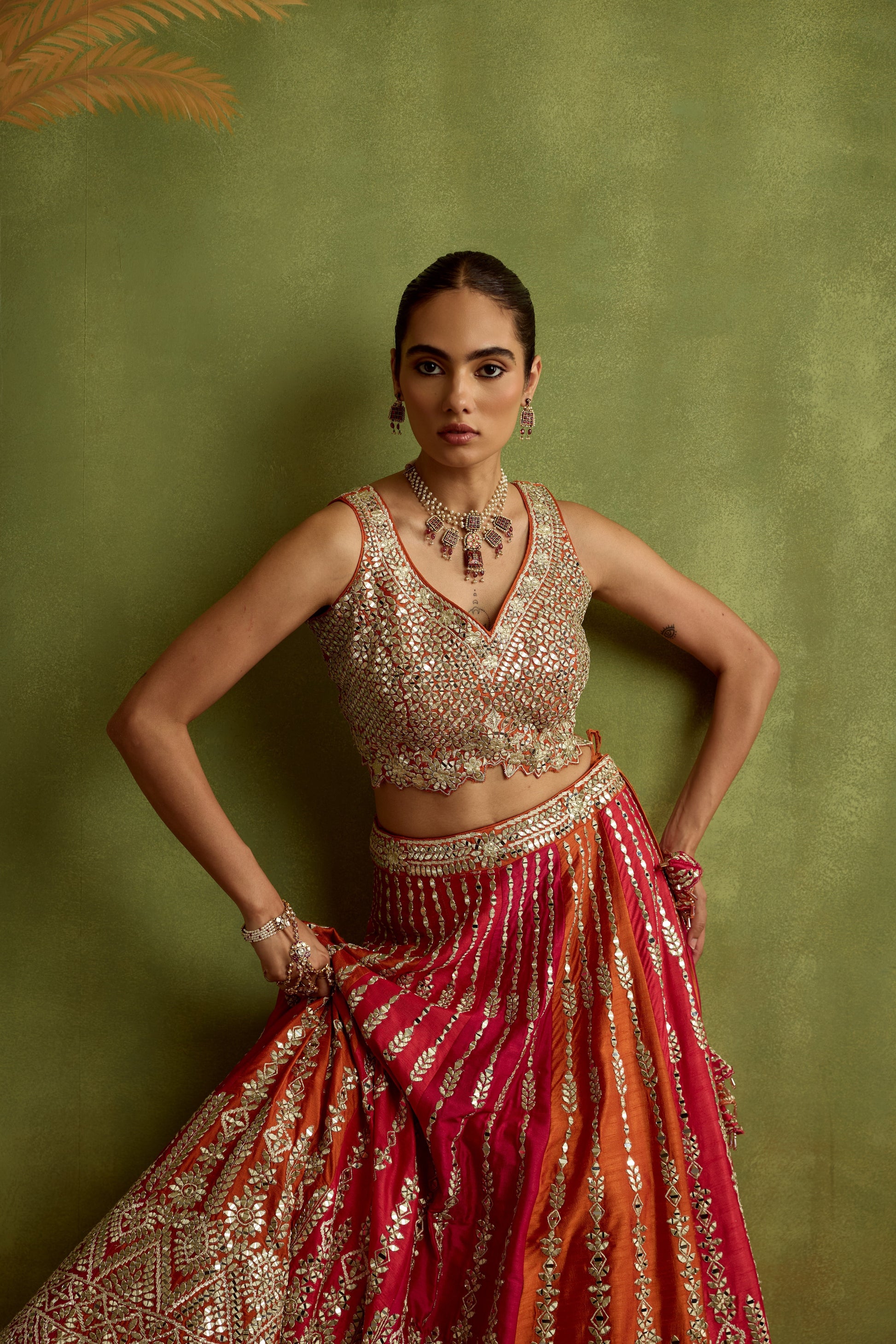 RUST,RANI AND CORAL SILK LEHENGA SET EMBROIDERED WITH ZARI MIRRORWORK.